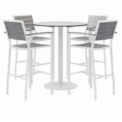 Eveleen Outdoor Bistro Patio Table with Four Gray Powder-Coated Polymer Barstools, Round, 41″h, White