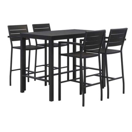 Eveleen Outdoor Bistro Patio Table with Four Black Powder-Coated Polymer Barstools, 32 x 55, Black